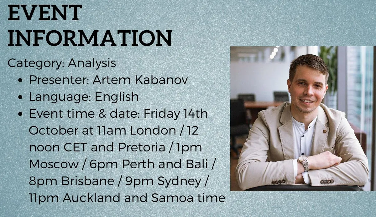 - Event time & date: Friday 14th October at 11am London / 12 noon CET and Pretoria / 1pm Moscow / 6pm Perth and Bali / 8pm Brisbane / 9pm Sydney / 11pm Auckland and Samoa time