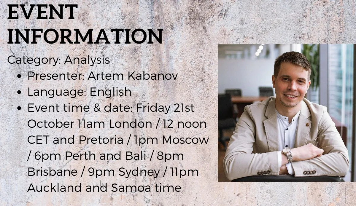 - Event time & date: Friday 21st October 11am London / 12 noon CET and Pretoria / 1pm Moscow / 6pm Perth and Bali / 8pm Brisbane / 9pm Sydney / 11pm Auckland and Samoa time